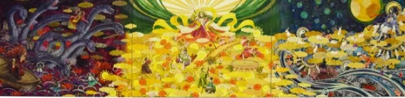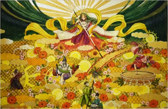 三貴神と呼ばれる太陽神「天照大御神」、月神「月読命」、海原の神「須佐之男命」の三柱の物語の場面です。透明水彩をメインに使用し、重厚感と軽やかさ神秘性を意識して制作しました。人物、動物、背景それぞれが引き立つように、構図にもこだわって制作しました。