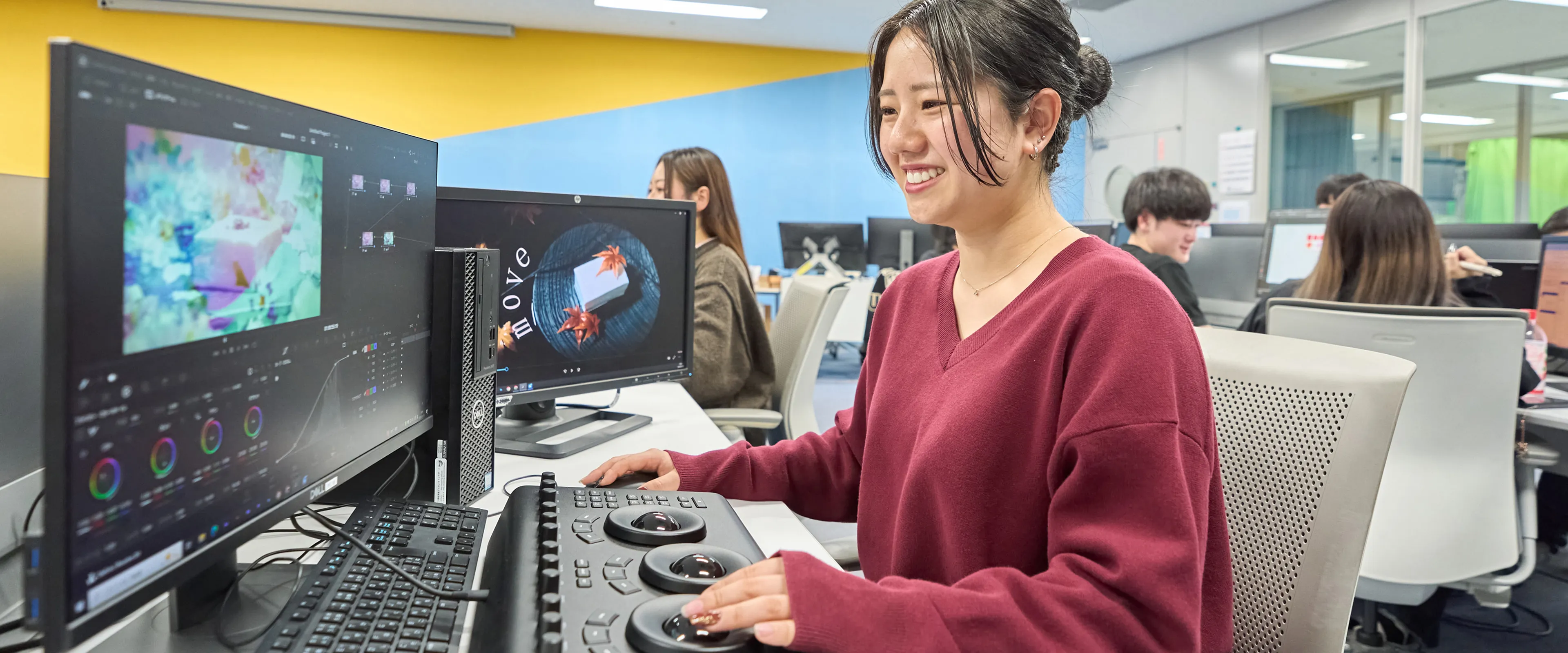映像クリエイター科は、ハリウッド映画やCMなど、プロの制作現場で使用されているBlackmagic Design社製の映像編集ソフトウェア「DaVinci Resolve Studio」を教育課程に導入。実際の制作現場と同じ環境で編集・カラー・VFX・サウンド制作などを学び、映像制作の総合的なスキルを習得できます。