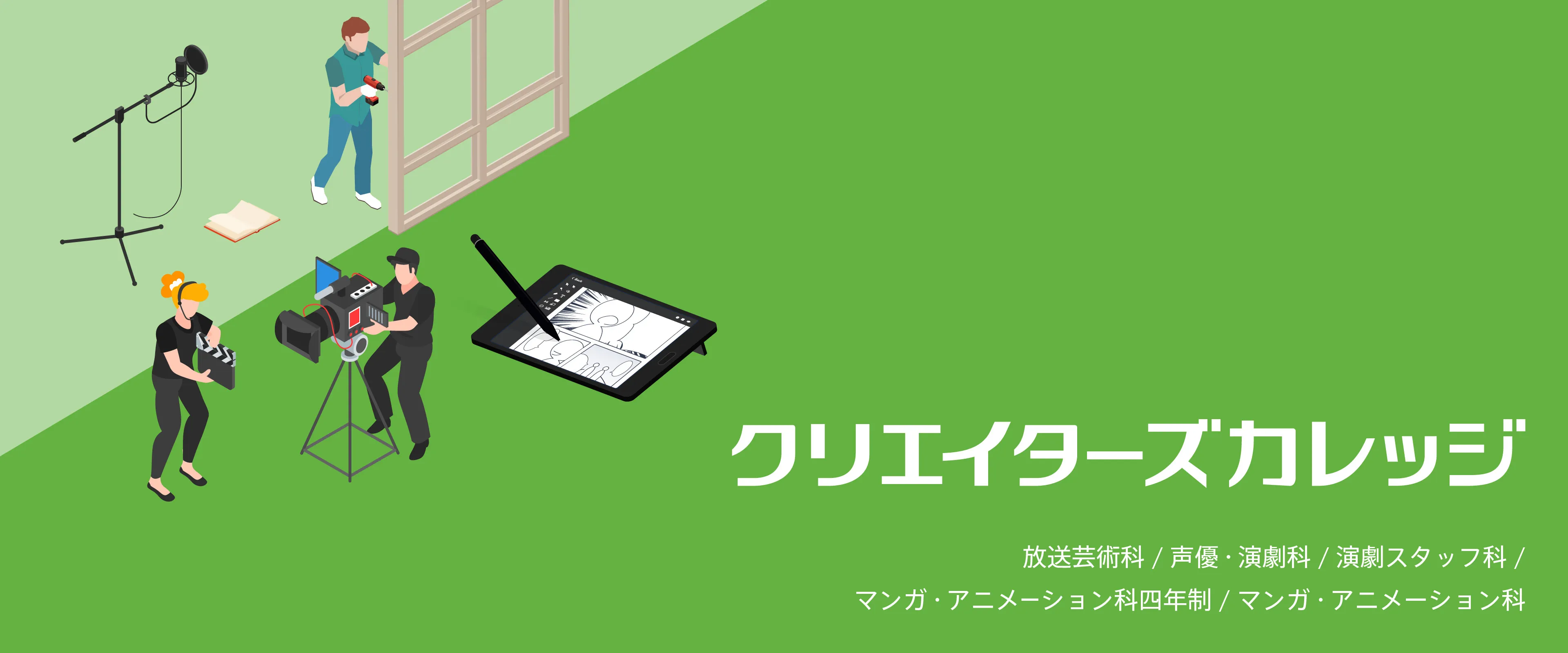テレビ・映画、声優・俳優、演劇・芸能・舞台、アニメ・マンガなど、さまざまなジャンルの最先端で活躍するクリエイターを育成する、クリエイターズカレッジ。プロの現場同様の最新の設備を使用した、現役の有名プロクリエイターによる指導で、業界の第一線で活躍するためのスキルを身につけます。コンテストやデビューに向けた支援も充実。優秀な人材をクリエイティブ業界に送り出しています。