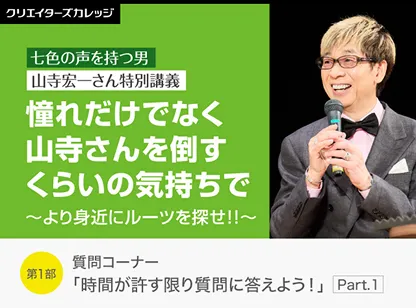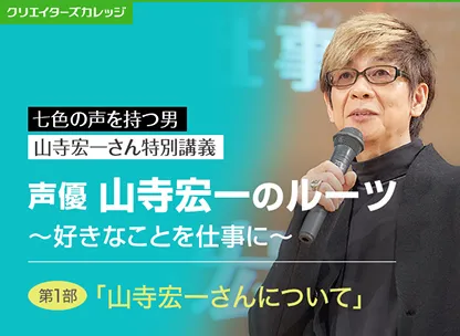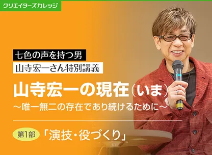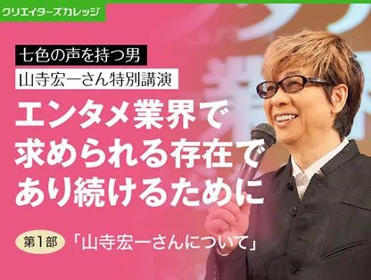 クリエイターズカレッジでは、2021年より、声優・俳優として多方面で活躍されている山寺宏一さんによる特別講演を開催しています。司会進行役は、山寺さんと親交の深い冨永みーな先生(声優/声優・演劇科講師)。学生たちにとって、将来エンタテインメント業界で活躍するためのヒントが得られる貴重な機会です。