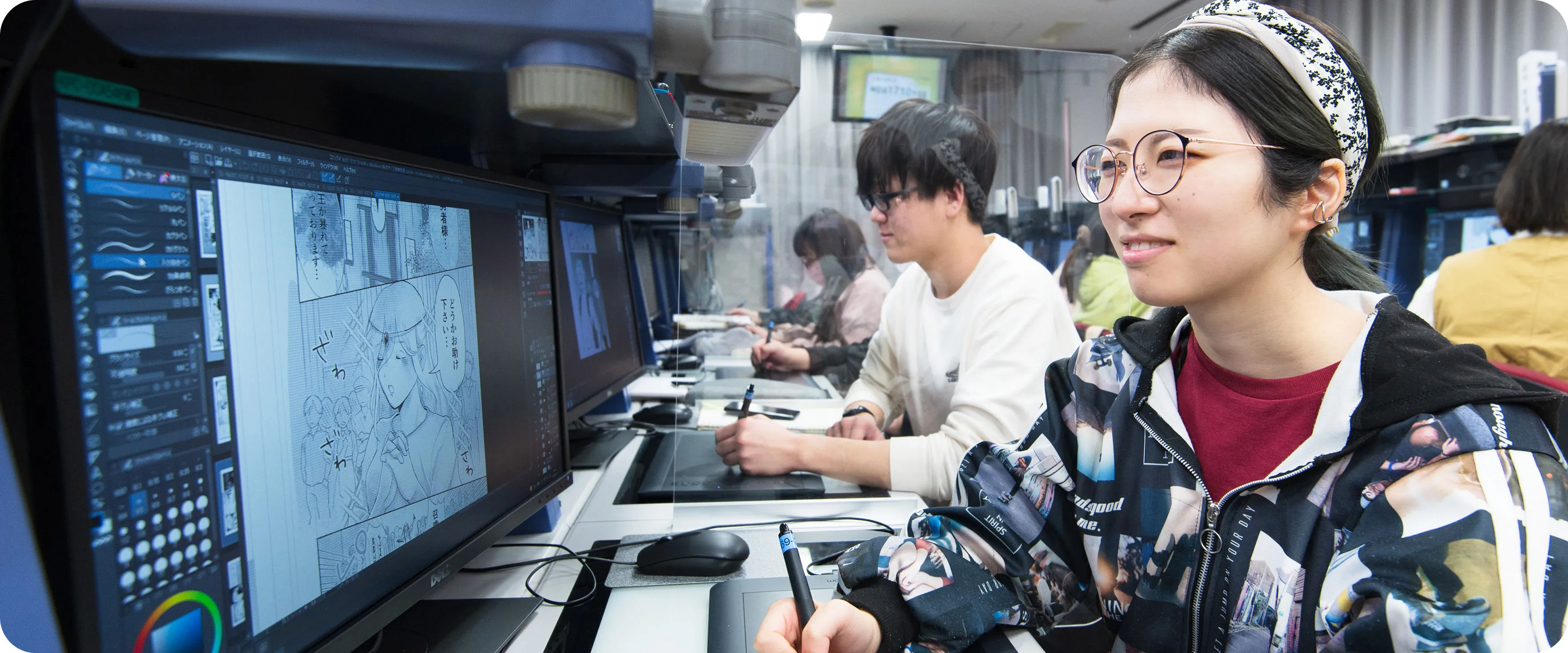 プロのマンガ家やマンガ家アシスタントが講師となり、企画(プロットやネーム)、作画、仕上げなど、各工程のスキルを直接指導。企業や地域社会との連携課題などにも取り組みます。