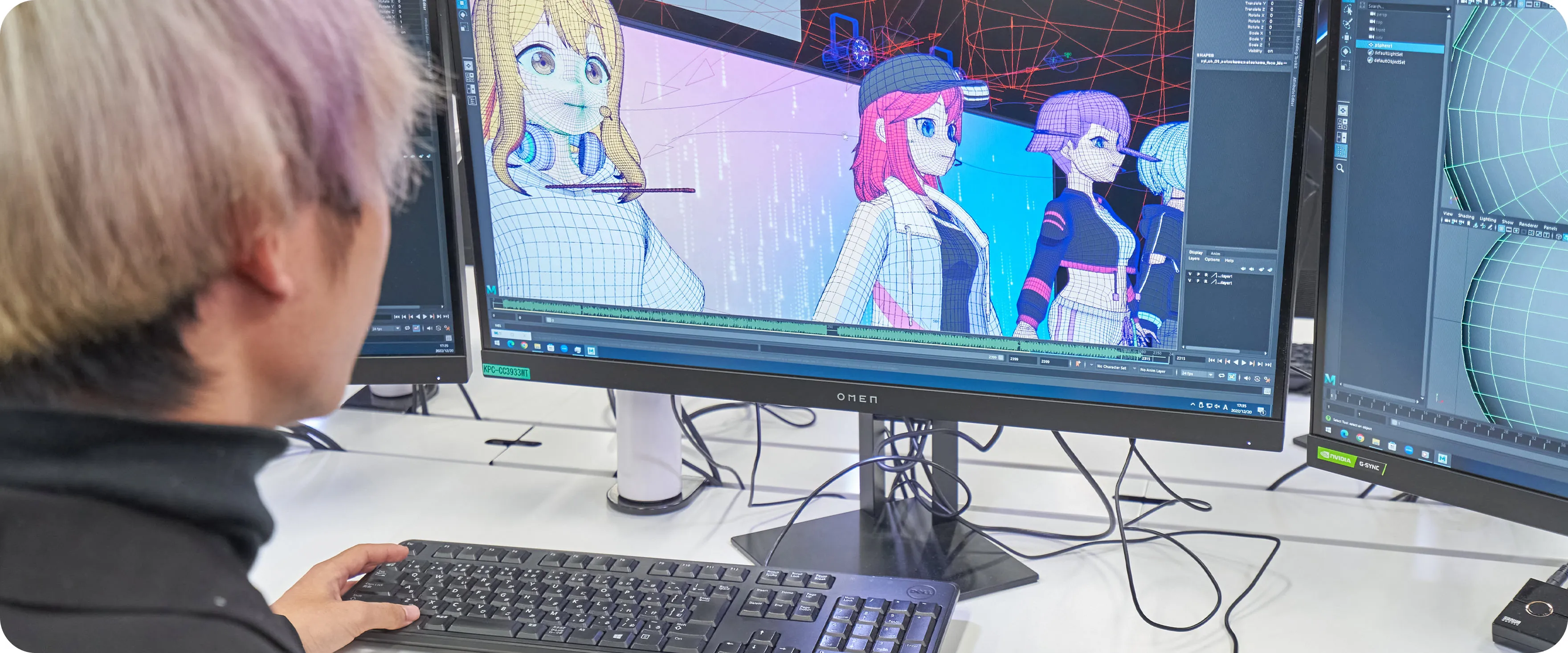 アニメ業界への就職を目標に、キャラクターのモデリング、モデルに動きを付ける3Dアニメーション、2D背景、従来のアニメ調で描画するセルルック(セルシェーディング)の技術など、アニメCGデザイナーに必要な多彩なスキルを習得します。