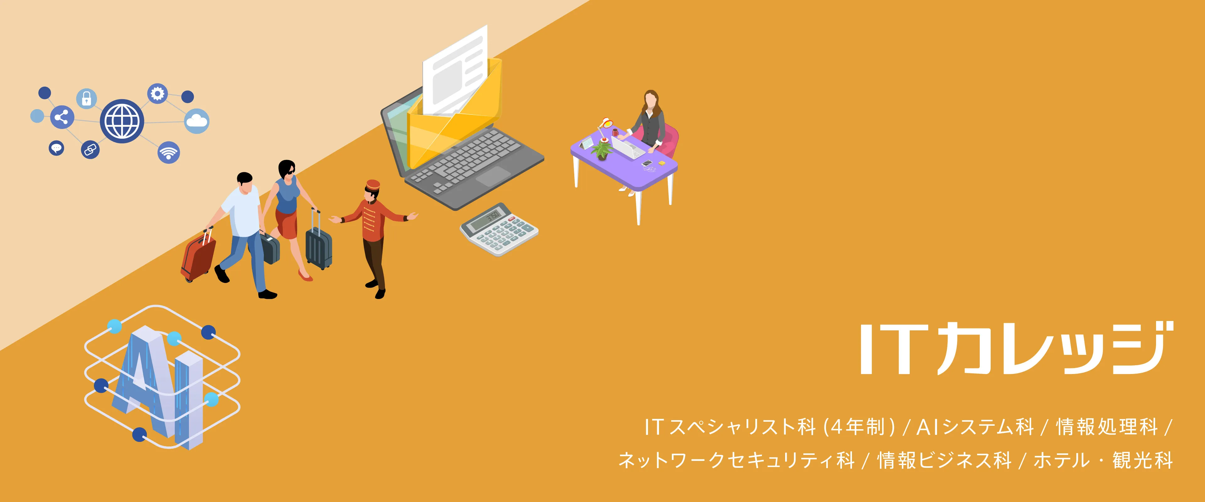 IT・AI・コンピュータ・パソコン・ホテル・観光専門学校の日本工学院ITカレッジは、6学科、12の専攻・コースを設置する東京の総合IT・コンピュータ専門学校です。ITのスキルだけではなく、IT・AI・IoTを活用した”ものづくり”を体験することで、ソリューション力(問題解決能力)、イノベーション力(新しい価値を生み出す力)を身につけることが可能。また基礎から段階的に学ぶカリキュラムを採用していますので、文系出身の方でも、自分の目標に合わせた学習スタイルで安心して学べます。IT・ホテル・観光系には必須の資格取得や、希望する業界・業種、そして企業へと進路を進めるための就職サポートも万全です。半世紀以上の教育実績、そしてつねに最新の技術を取り入れたカリキュラムが、日々進化するIT・ネットワーク社会の先端で活躍するエンジニア・技術者、観光・ホテル業界で活躍する人材を育成します。ITカレッジで学ぶことのできる、AI系、システム開発系、Web系、アプリ開発系、ネットワークセキュリティ系、システム運用系、ビジネス系、ホテル・観光系など多彩な分野から、自分がめざす学科を選びましょう。