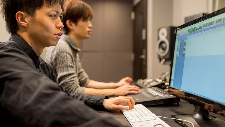 1年次は音響の基礎を徹底的に学び、2年次には実践的な応用スキルを習得。機材の準備や配線から、オペレーションや音響設計まで、段階的に学べるカリキュラムで、音響のプロフェッショナルをめざします。