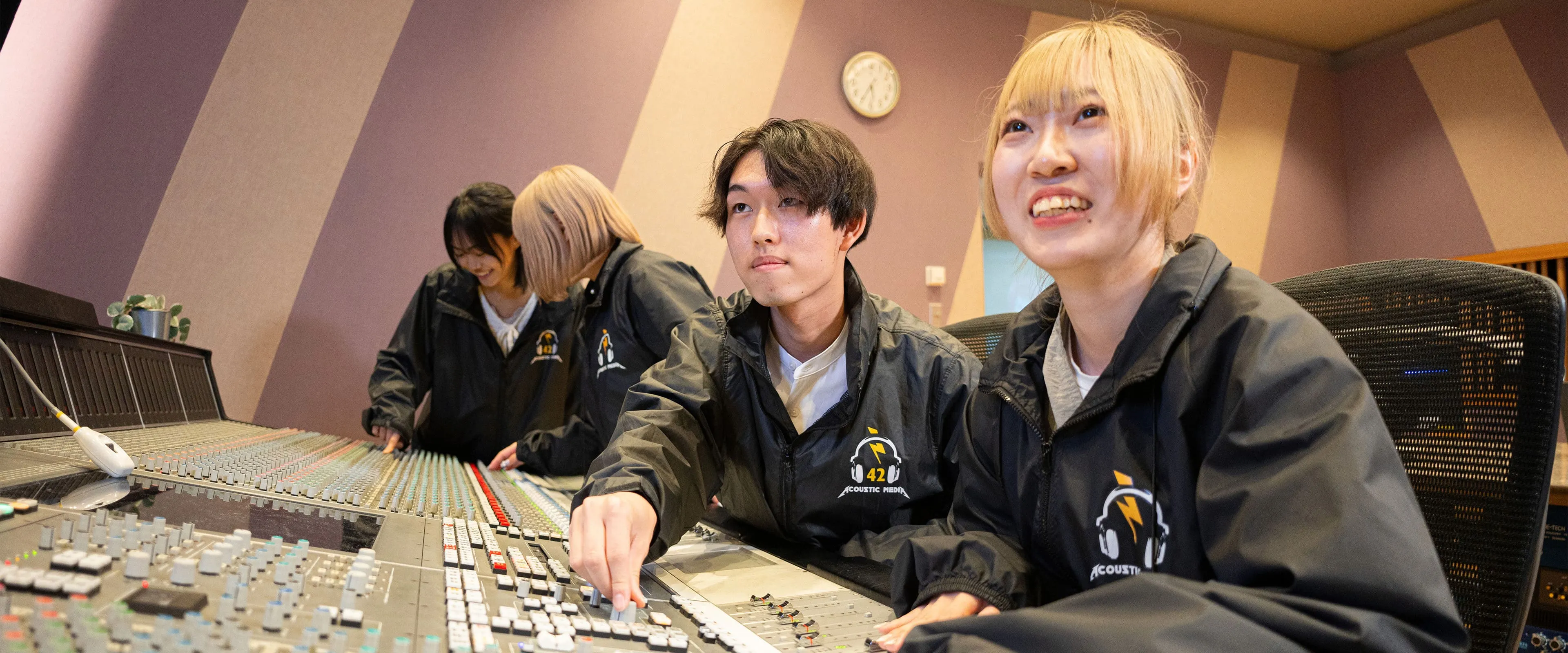 40年以上の歴史を持つ音響芸術科は、音響教育の分野で確固たる信頼を築いてきました。卒業生は大手レコード会社や放送局、映像制作スタジオなど、音楽・映像・放送業界の第一線で活躍中。業界との強いネットワークを生かし、インターンシップやプロアーティストとの共同制作など、現場経験を積む機会も豊富です。業界が求める人材を育成する教育機関として高い評価を得ています。 -