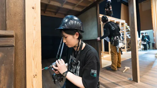木材をはじめ、さまざまな素材を使って舞台の骨組みとなるセットを作ります。金づちやのこぎりはもちろん、専用の工具を使って手際よく組み立てます。