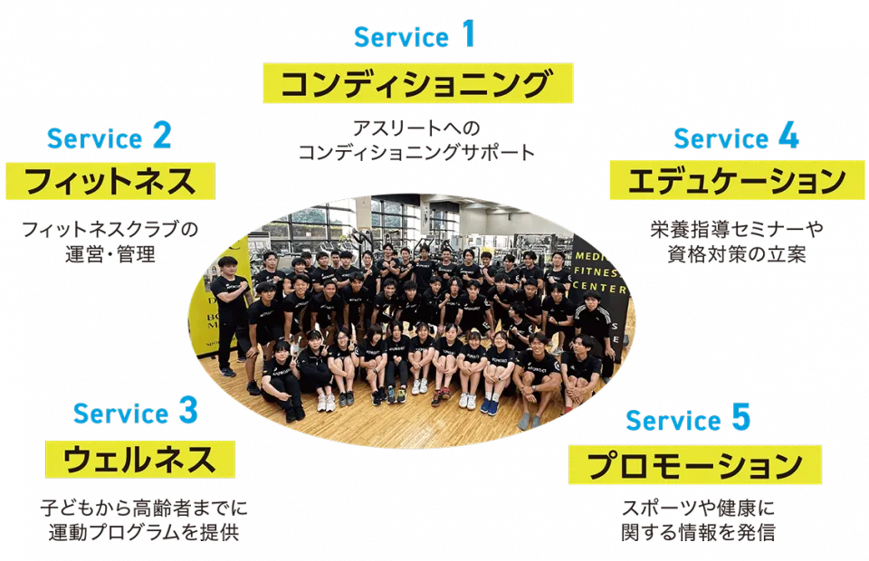 教育の核となるのが、最新のスポーツクラブの設備と機能を持つ「MFC(メディカルフィットネスセンター)」。スポーツ系学科では、MFCをフルに活用した「MFCプロジェクト」を展開。「コンディショニング」「フィットネス」「ウェルネス」「プロモーション」「エデュケーション」の5つのサービス領域で学習成果を発揮することで、実践力やコミュニケーション力などを高め、スポーツ業界で即戦力として活躍するためのプロの力を養成します。