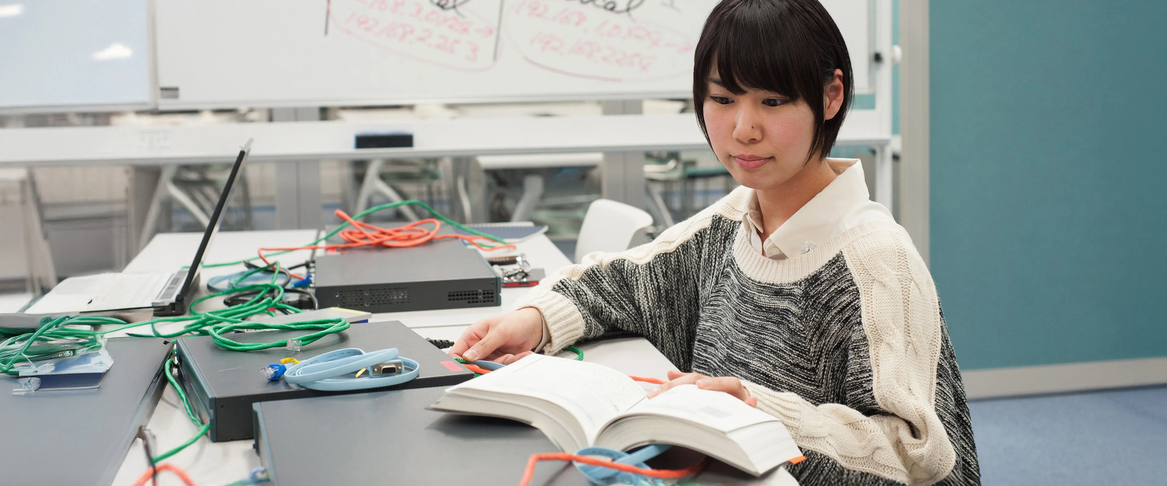 ITの基礎から、パソコンの設定・カスタマイズや、サーバ・ネットワークの設定と運用など、基礎からネットワーク運用のための専門分野までを段階的に学べる授業を用意。実践的なカリキュラムを通じて、現場で活躍できる技術と知識を習得します。