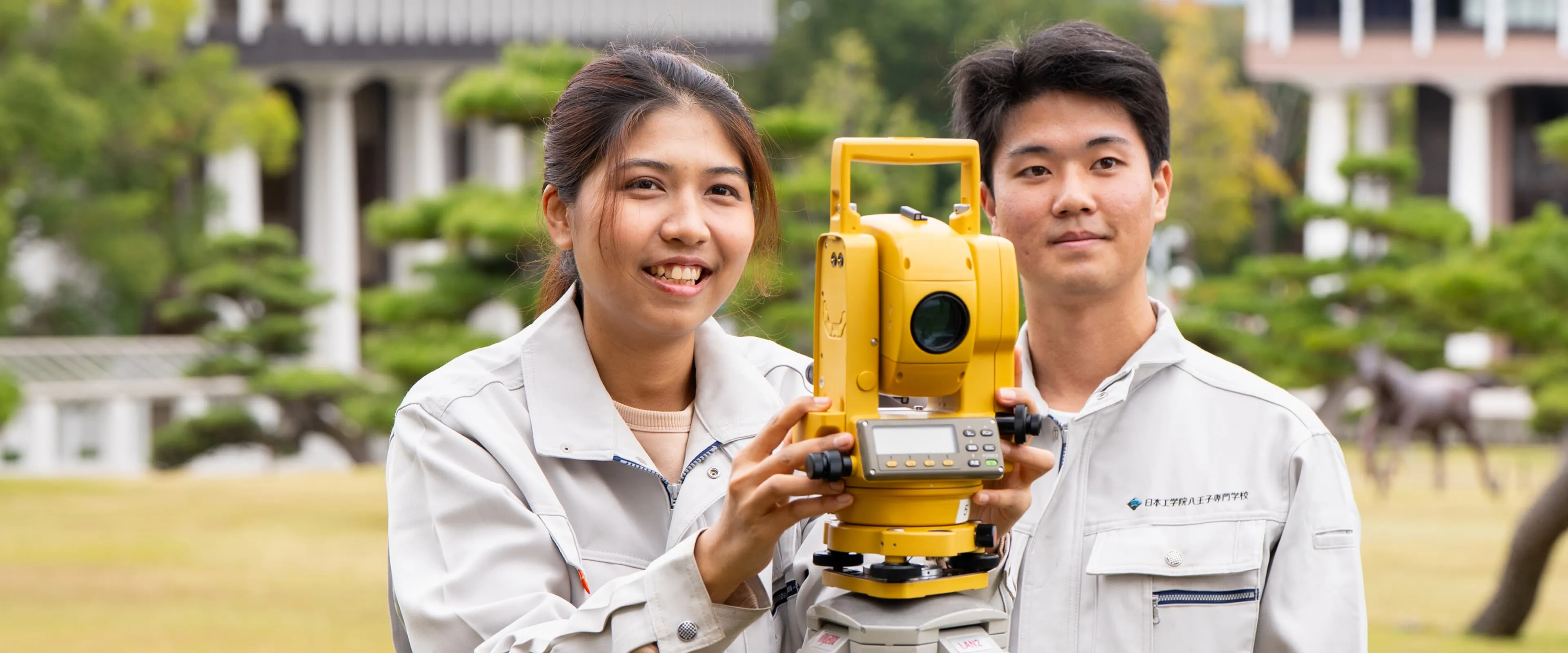 二人の学生が測量の実習をしている様子