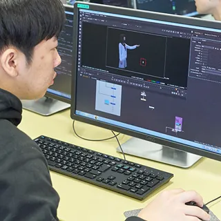 CG映像において、キャラクターと背景、実写映像を合成するコンポジットや、視覚効果(閃光、爆発、炎など)を加えるビジュアルエフェクトについて学びます。業界の定番ソフトである「Maya」や「After Effects」のほか、「Nuke」(1カットのクオリティーを上げることに特化したコンポジットソフト)や「Houdini」(高度な物理現象のシミュレーション機能を備えた3DCGソフト)など、近年注目度が高まっているハイエンドソフトも授業に導入し、VFX系の基本スキルをしっかり養います。また、映像作品として完成させるための映像編集テクニックもマスターします。