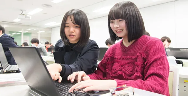 日本工学院のカリキュラムは、学習内容を段階的に明示し、学生一人ひとりの習熟度に合わせて無理なくスキルアップできるように作られています。だから、ITの初学者でも大丈夫。最初は、キーボードのタイピングやパソコンのしくみを覚えることから始めます。そして、最先端のIoTデバイスを使ってものづくりの感動を味わい、ハンズオン学習(体験学習)を通して、少しずつITスキルを身につけていきます。セキュリティの知識やスキルについても、初歩から教えています。