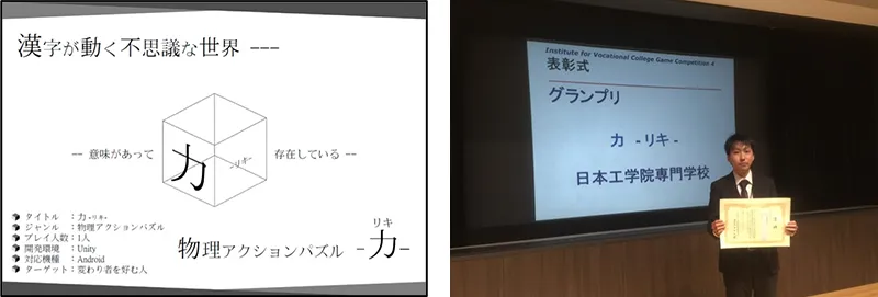 一般社団法人 全国専門学校情報教育協会主催で実施されました、第4回全国専門学校ゲームコンペティションにおいて、日本工学院専門学校クリエイターズカレッジ ゲームクリエイター科四年制 2年生の安藤大智さんが制作した「力」がグランプリを受賞。また日本工学院八王子専門学校クリエイターズカレッジ ゲームクリエイター科四年制に在籍する学生グループが制作した「DEFECTORS」が準グランプリを受賞し、1月28日(木)東京都内において開催された最終審査・プレゼンテーションにおいて表彰を受けました。同コンペティションにおいて日本工学院は、3年連続の受賞となります。
