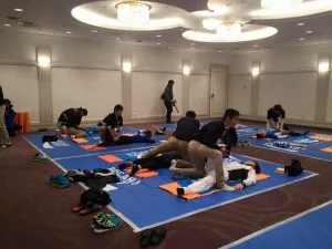 本校卒業生で講師を務める米本先生が所属するルートヴィガー様ご協力のもと、ランナーの皆さまへパートナーストレッチを施しました。
