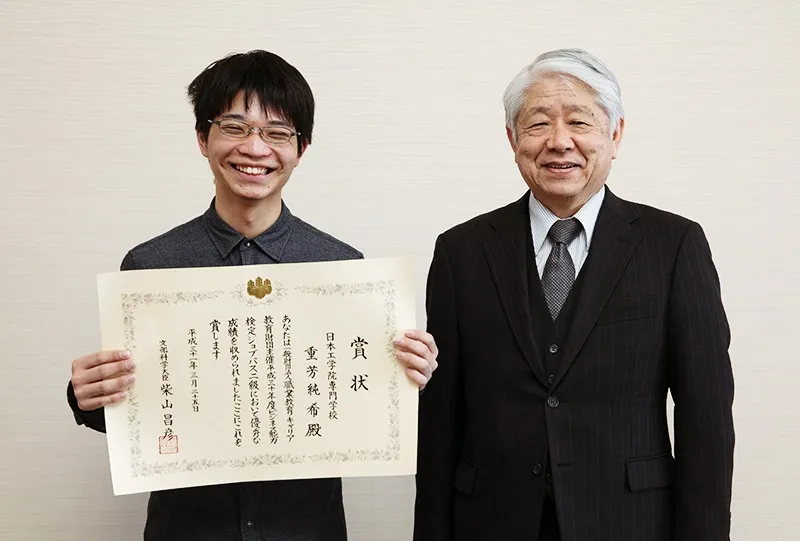 日本工学院専門学校テクノロジーカレッジ 建築設計科学生・重芳純希さん(千葉県立国府台高等学校 出身)が、一般財団法人職業教育・キャリア教育財団が実施する、平成30年度ビジネス能力検定(B検)ジョブパス二級において、合格者1,525名(2級)の中で優秀な成績を収め、文部科学大臣賞を受賞。4月11日(木)日本工学院蒲田キャンパスにて、前野校長より賞状の授与が行われました。