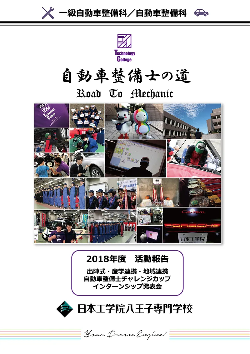 日本工学院八王子専門学校 テクノロジーカレッジが設置する一級自動車整備士科/自動車整備科では、産学連携や地域連携を通して人間力や社会人基礎力の習得に取り組んでいます。こうした取り組みを「自動車整備士の道」という小冊子にまとめました。内容は、「自動車整備士チャレンジカップ」「インターン実習」「インターン発表会」「卒業制作」など、学生の活躍と自動車業界との連携を主に掲載しています。ぜひ、ご覧ください。