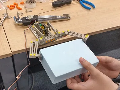 写真は機械設計科1年のロボット製作時のものです。学生は工学知識とCADの実習を中心に学習しています。今回は汎用性のある部品を使用して発砲スチロールのブロックをつかむ機構を製作しています。