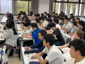学生さんたちも専門的な話に耳を傾け、真剣に話を聞いています。さらに、佐藤社長より「これから社会に出るみなさんへ」という形で、楯の川酒造での若手の育成や実際に姉妹蔵である「奥羽自慢」の製造責任者である阿部 龍弥さんのお話も引き合いに出してアドバイスやエールもいただけました。