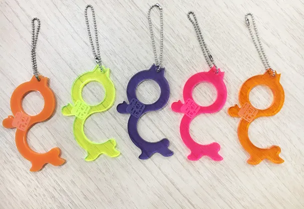 消毒や非接触など、ウイルスへの感染を予防することが必須の日常となった今、日本工学院八王子専門学校 機械設計科では、ウイルス感染予防として、共用物へ直接触れることを避けるための「オリジナルアシストフック(ぱっちぃフック)」を設計・製作しました。このアシストフックは、エレベーターなどのスイッチを押す時やドアノブ、電車の吊り革を触る時などに、直接手触れないで作業を行えるように考えたコンパクトなフックです。日本工学院八王子専門学校、機械設計科の学生が学校のオリジナルキャラクターである「ぱっちぃ」をモチーフに3D-CAD(Fusion 360)を利用して設計を行いました。設計時には、電車のつり革に成人男性がつかまることを想定し、電車の急ブレーキ時にかかる加速度を条件にFusion 360の3Dシミュレーションで強度を計算、実証実験の結果と比較して材質、厚みの選定を行うなどし、使いやすく、かつ安全に使用できるようなものになっています。
