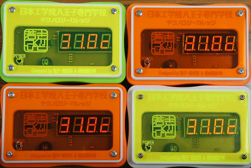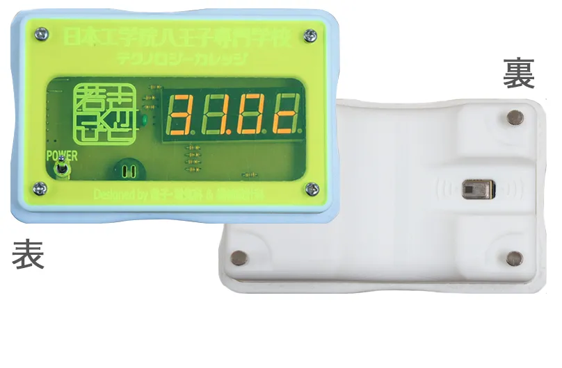 コロナ禍の中、さまざまなシーンで⽇常的に使用されることが多くなった⾮接触型体温計。この度、⽇本⼯学院八王⼦専⾨学校電⼦・電気科では機械設計科と共同で、「オリジナル⾮接触型体温計」を設計・製作しました。⾮接触型体温計は、⼈体に触れることなく、⾝体から出ている⾚外線量を測定することで熱を測ることができるもので、スイッチを入れて近づけるだけで体温がLEDで表⽰されます。また、ケースには透明なアクリル板を使用していますので、構成されている電⼦回路部品が⾒え、ものづくり技術を⽬で⾒て確認することができます。設計・製作は、電⼦・電気科が電⼦回路を担当し、電⼦回路CADを利用して設計、基板加⼯機で電⼦回路基板を作成。ケースは機械設計科が担当し、機械設計用3次元CADにて設計、透明アクリル板は切削加⼯機で加⼯し、ケース本体は3Dプリンタで出⼒を⾏いました。なお、製作にあたり、スポーツ・医療カレッジやデザインカレッジの先生方からもアドバイスを受けて試作を繰り返し、完成へとつながりました。