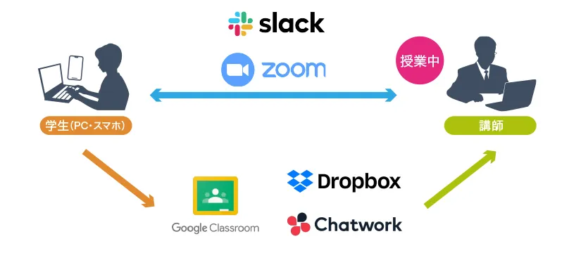 福永—照明コースではもともと学生全員がパソコン所持が必須でしたので、基本的な環境は大体揃っていました。先生の指導に従って、学校のアカウントを作り、SlackやZoomなど、オンラインでの授業に必要となるソフトをインストールしました。準備ができたところで「オンラインで集まりましょう!」という先生の言葉で、久しぶりにパソコンの画面上でクラスメイトや先生と会うことができたんです。