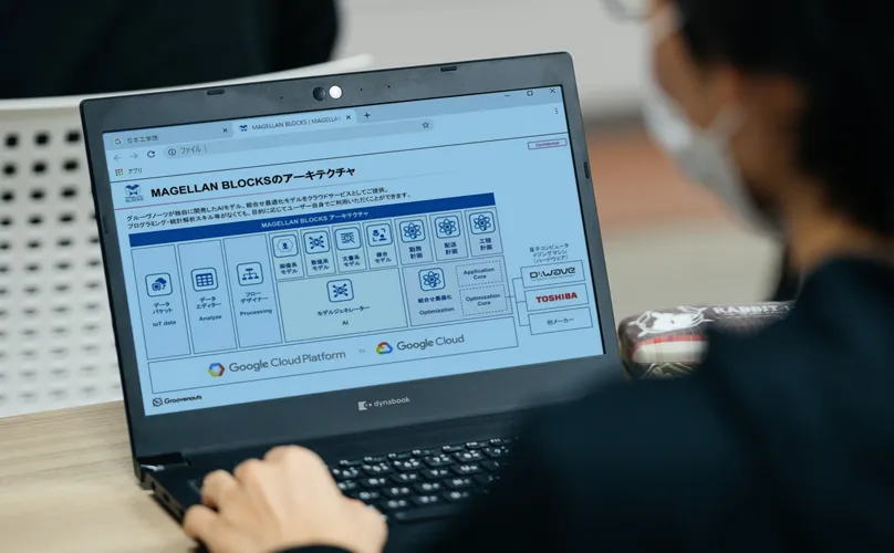 AIシステム科の「機械学習基礎」では、グルーヴノーツ社が独自に開発し、さまざまな企業が実際の業務で活用しているクラウドAIサービス「MAGELLAN BLOCKS(マゼランブロックス)」を使って、機械学習について実践的に学びます。「MAGELLAN BLOCKS」は、難しい技術を誰でもシンプルに使えることをコンセプトに開発された企業向けのプラットフォームです。プログラミングの知識がなくても視覚的に操作できるため、機械学習の特性を知り、活用するための思考力・想像力を養うには最適な教材です。