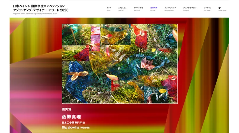 「日本ペイント 国際学生コンペティションアジア・ヤング・デザイナー・アワード(Asia Young Designer Award)」は、アジア15の国と地域でエントリー総数が8400名を超える、大きなコンペティションで、アジア各国の学生が国をまたいで同じテーマに取り組み、審査はそれぞれの国で行われます。第8回目を数える今回のテーマは「光の可能態」。専門学校生での受賞は西郷さんのみで、他の受賞者は大学院生や学部生。審査員の講評でも西郷さんの作品「Big glowing waves」は高く評価されています。