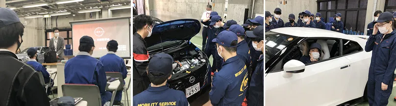 電気自動車/e-powerといった電動技術をはじめ、先進安全技術やGT-R/スカイラインなど、スポーツカーの実車確認、本校OBとのトークセッションなどを行いました。