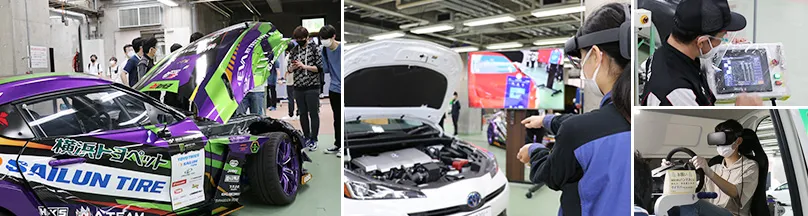 学科の枠を超え、自動車系の学科のみならず機械設計科、ロボット科、AIシステム科、ITスペシャリスト科の在校生や、オープンキャンパス+体験入学に参加した高校生も参加し、自動車整備における最新IT技術(AR:拡張現実/VR:仮想現実)や最新塗装ロボットの技術を学びました。さらに、レーシングカー(D1スープラ)の展示や解説も実施し、様々な分野が学べるモビリティの多様性を感じる授業となりました。
