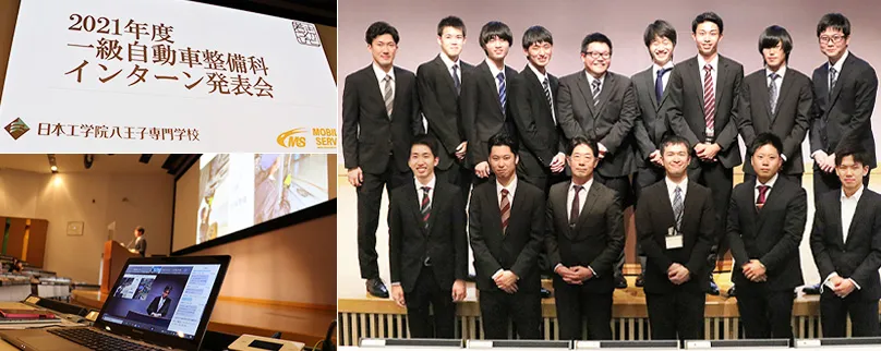 一級自動車整備科では、4年次に企業で行うインターン実習(223時限·約28日間)が必修科目となっており、その成果を後輩や保護者、また企業様へ報告する「インターン発表会」を開催いたしました。今年で5回目となるこの発表会は初のハイブリッド開催となり、キャンパス内メディアホールにて、在校生(一級自動車整備科/自動車整備科)は対面で参加、保護者と企業19社様はオンラインにてご視聴いただきました。