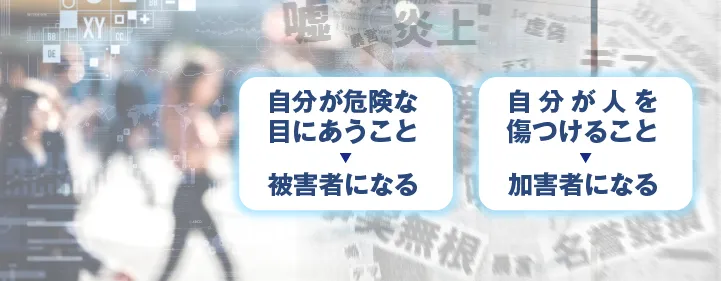 そしてインターネットによって私たちが陥る危険には2つのタイプがあります。一つは自分が危険な目に遭うこと(被害者になる)で、誹謗中傷や依存、有害情報、なりすまし、詐欺、個人情報搾取などがあります。一方、自分が人を傷つけること(加害者になる)もあるのです。これは故意にではなくても、軽い気持ちでインターネット上に書き込んだことが、誹謗中傷や炎上、権利侵害、情報漏洩、不正アクセスなどに繋がり、他人を傷つけたり、損害を与えてしまい訴訟問題になることもあります。