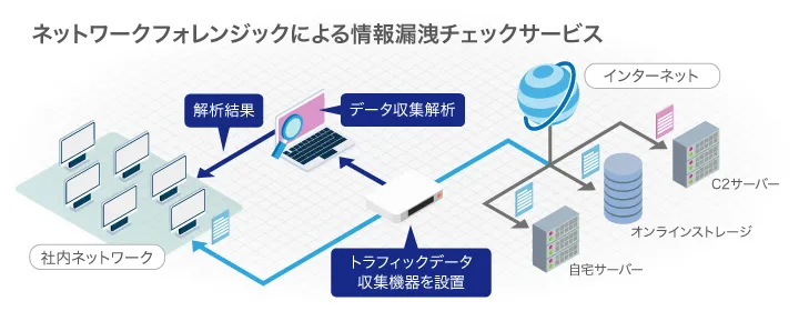 セキュリティの技術は日々進化しています。2008年頃から、コンピュータフォレンジック技術やログ分析の技術を使い、どういう攻撃をされて侵害事実があるのか、侵害された場合の影響範囲について調査・分析を行い、お客様の環境で生じるセキュリティインシデントに対応する業務を開始。さらに2012年にはネットワークフォレンジックを活かしたサービスが始動。これは、ネットワーク上のデータの動きを記録、その内容を調査・解析してサイバー脅威やセキュリティインシデントなどの不正通信を特定する技術のことです。ネットワークフォレンジックの技術は海外のカンファレンスで知り、日本でも取り入れようと「情報漏洩チェックサービス」というサービスを当時の上司と共に立ち上げました。