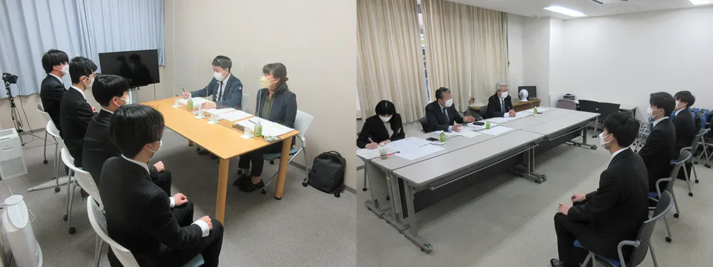 電子・電気科では、2000年から就職指導の一環として、業界企業の人事担当者を模擬面接官としてお招きし、模擬面接を実施しています。今年度は、機械設計科の学生も加え、グループに分かれての開催となりました。