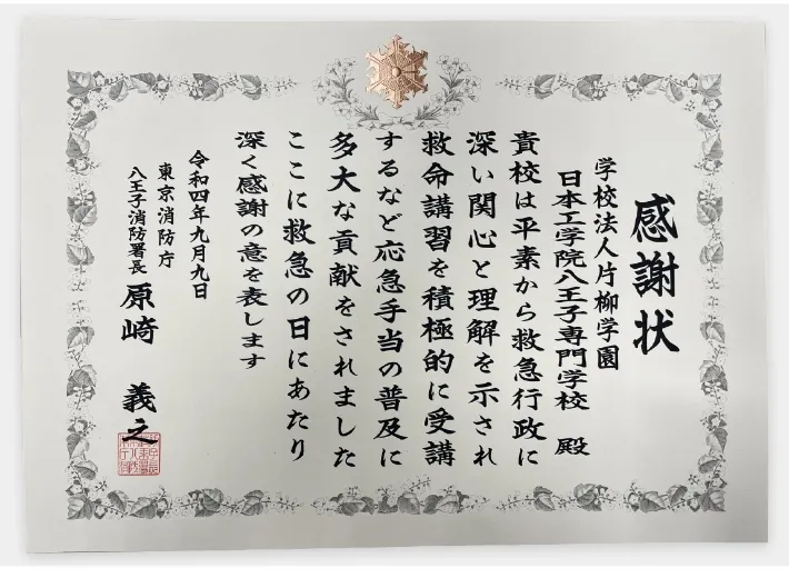 自動車整備科が実施した上級救命講習の受講に対して、東京消防庁八王子消防署より感謝状が贈呈されました。山野副校長が日本工学院八王子専門学校を代表し感謝状をいただきました。