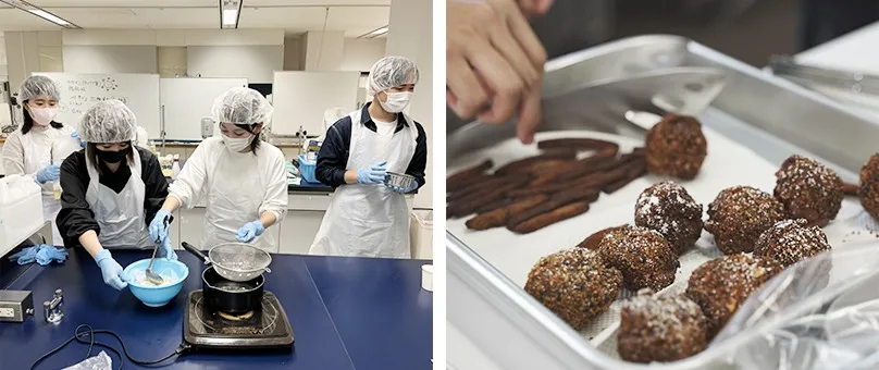 8月には夏休み期間を利用して、各々が気になったスイーツの市場調査を行い、新商品のヒントになるものを探し、そこから新商品の着想を得ました。それを形にするため、9月には試作・試食を重ね、商品の企画し、それを実現する方法を模索し、スクラップ&ビルドを繰り返して、試作品を作り上げます。試作では、なかなか思うような味や食感にならず、求める品質の達成に苦心しましたが、7人の学生が工夫を重ねてようやく試作品を完成させることができました。