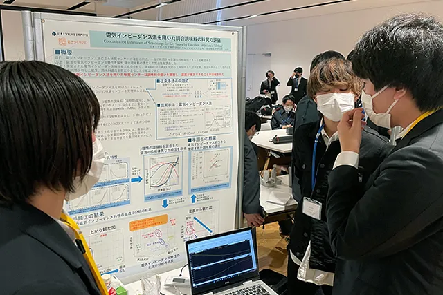 私たちが今回発表した「電気インピーダンス法を用いた調合調味料の評価」は、小林先生や一期生の先輩が手がけていた研究テーマのアイディアを引き継いで発展させたものです。センサーで調味料のインピーダンスを計り、その特性をAIでデータ化・解析し、出汁やスープなどに含まれる調味料の種類や濃度、割合などを数値化するというものです。液体中に何がどのくらい入っているのかがわかるため、計るだけでその料理をレシピ化でき、同じ味が再現できるようになるのが目標です。