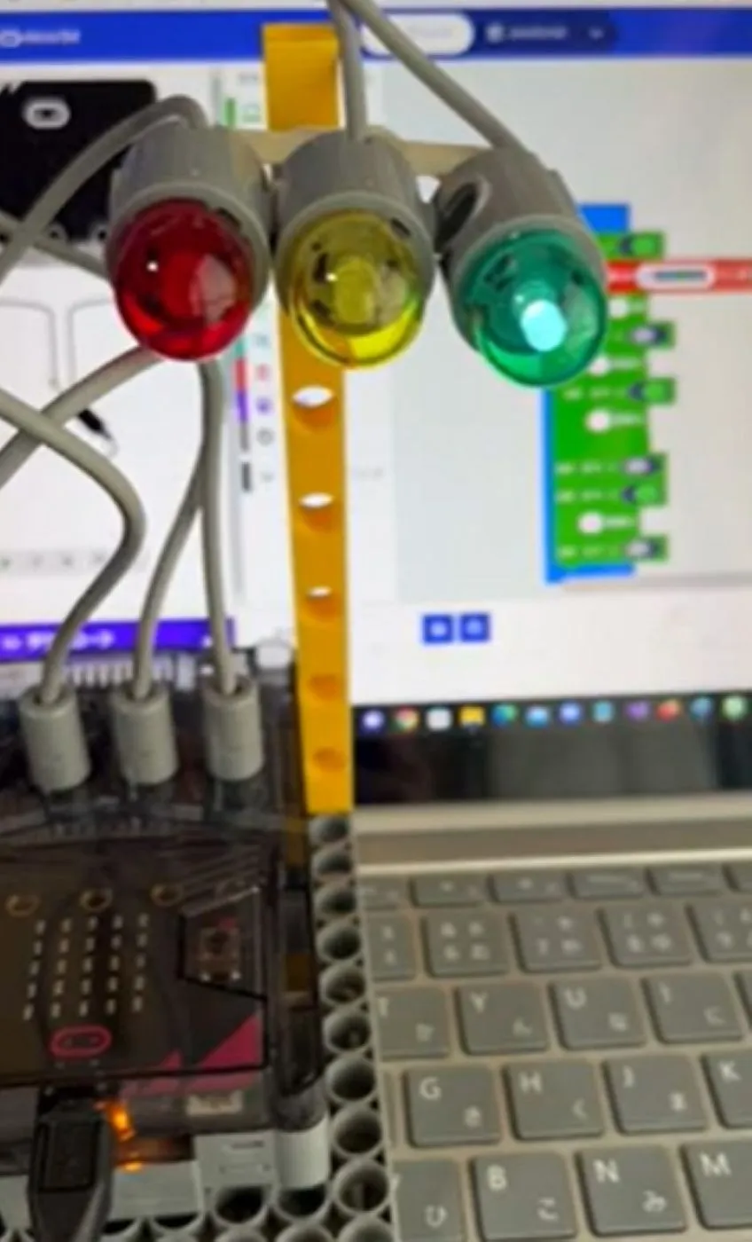 2022年11月に小学4年生を対象に行われた「学区域の信号機をつくろう」というテーマで行われたプログラミング教育の授業では、学生7名+教員1名が、Micro:bit※1とLEDを組み合わせ信号機に見立てたハードウェアに、Microsoft MakeCode※2を活用したプログラムで、信号点滅の制御を体験してもらう授業を実施しました。