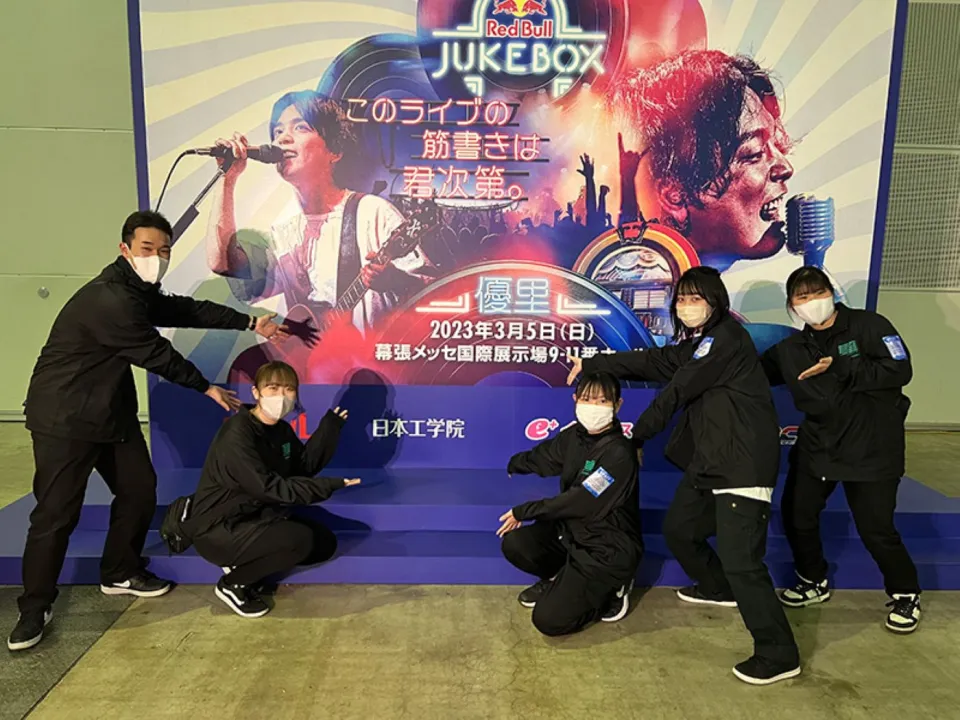 2023年3月5日(日)に千葉市にある幕張メッセにて、Red Bull JUKEBOX 2023が開催されました。日本工学院ミュージックカレッジ蒲田キャンパスコンサート・イベント科の学生がフォトスポット、楽屋周りなどの運営サポートでインターンとして参加いたしました。