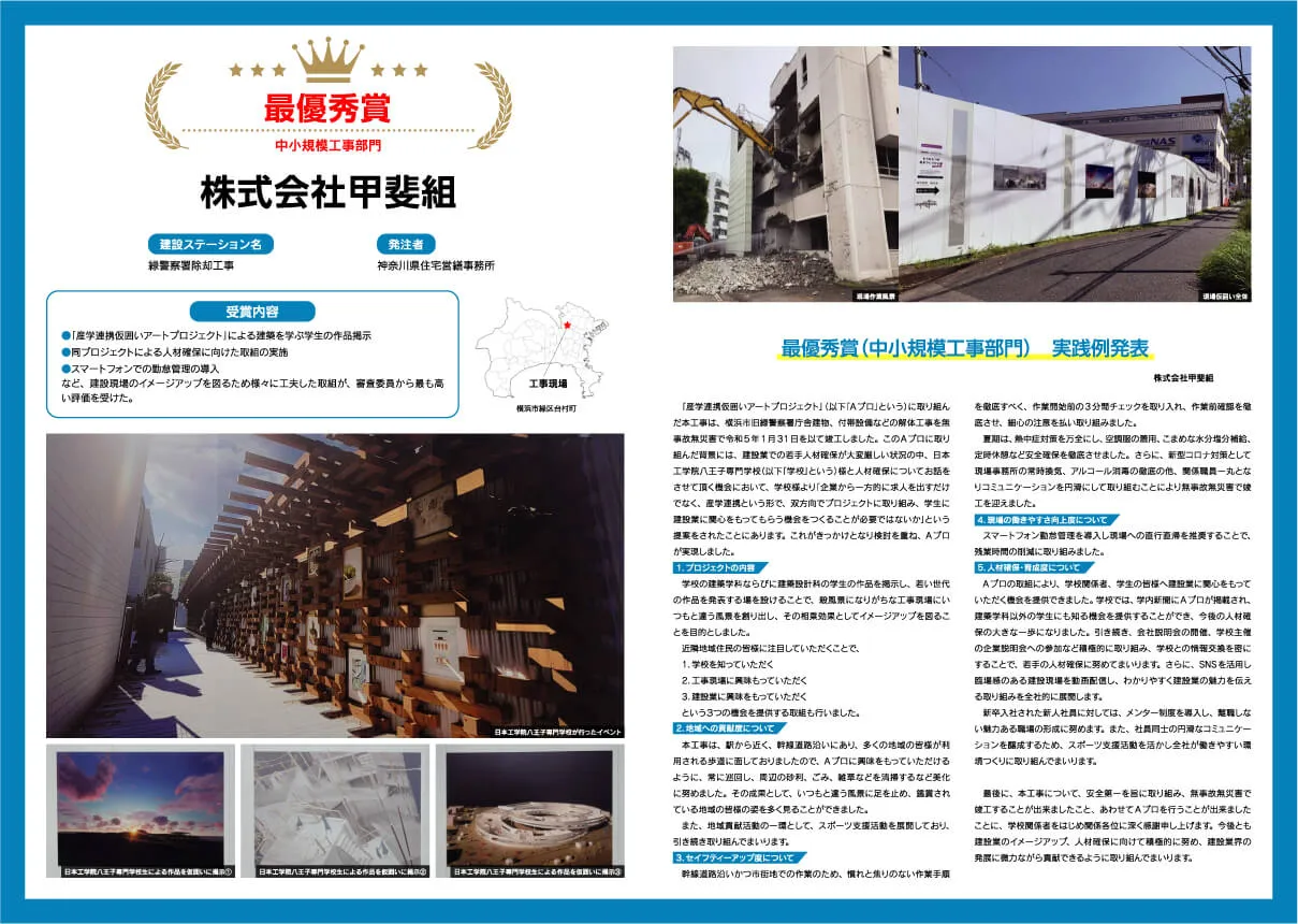 同プロジェクトは「神奈川県魅力ある建設事業推進協議会」主催、令和4年度 建設ステーション元気アップコンテスト 中小規模工事部門にて「最優秀賞」を株式会社甲斐組が見事受賞されました。