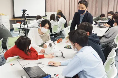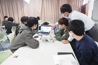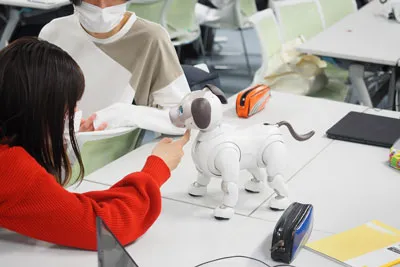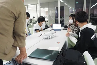 ITスペシャリスト科では2023年4月より、「aibo」をプログラミング教育、IoT教育用の教材として正式導入しており、今回の特別講義は教材としての導入をサポートしていただいたソニーグループ様のご協力のもと実現したものです。 今回の講義では、はじめに「aibo」開発におけるチームの思い入れやこだわりなどの説明とともに、「aibo」ができることや各種機能などをひと通りご説明いただき、その後、3,4名のチームに1台の「aibo」が渡され、音声での制御、プログラムでの制御などを実際に手を動かしながら体験しました。