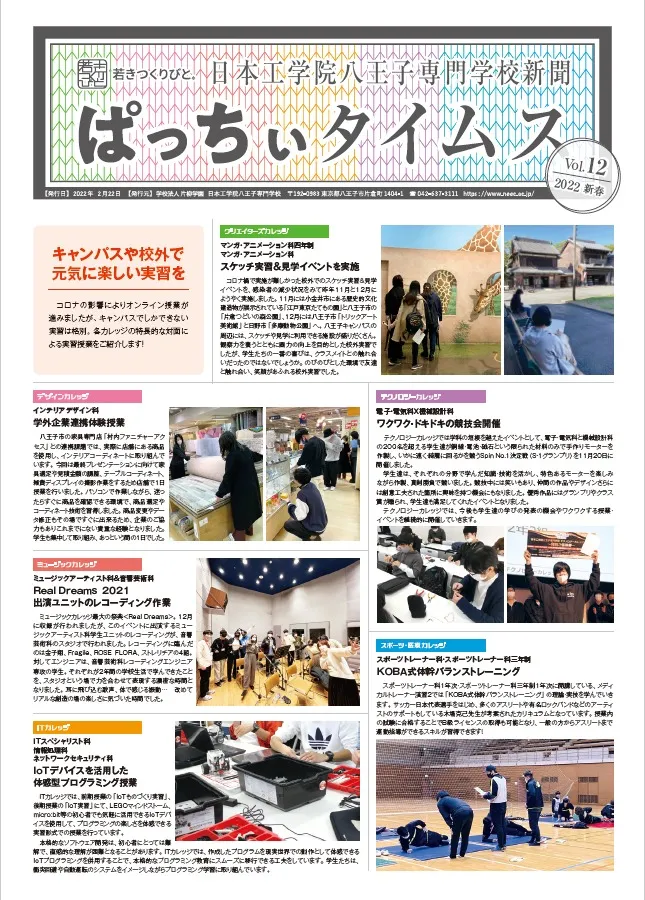 日本工学院八王子専門学校では、八王子キャンパスのニュースや出来事を新聞にして、季刊発行しています。より多くのみなさまにご覧いただけるよう日本工学院Webサイト上でも公開しています。画像下のタイトルをクリックすると電子ブックでご覧いただけます。
