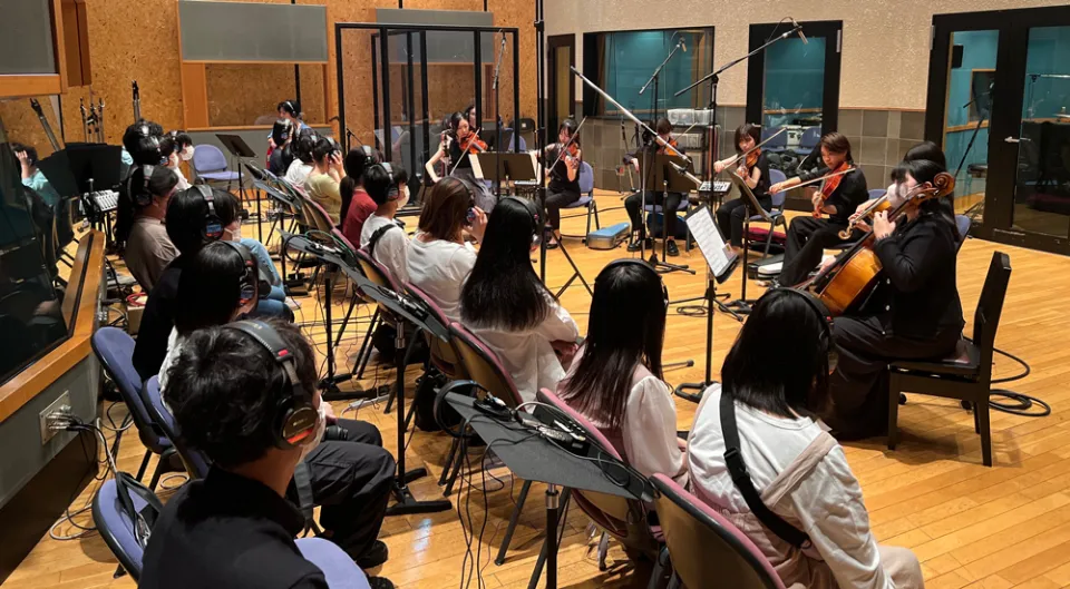 最後は、江戸川橋駅近くのキング関口台スタジオです。 このスタジオでは、ミュージックアーティスト科とのこコラボレーション授業とし、レコーディングエンジニア専攻の校外実習も兼ねて実施されました。 ミュージシャンには、本校講師のプロミュージシャンたちを迎え、今回のためだけにオリジナル曲をアレンジしてレコーディングをさせて頂きました。 その他、バイオリンやチェロなどのストリングス、ミュージックアーティスト科の学生コーラス隊も入った豪華なアレンジとなりました。 ツアー参加者は実際のレコーディングを普段では体験できない形で見学をし、実際にレコーディングがどのように行われているのか興味津々の様子でした。