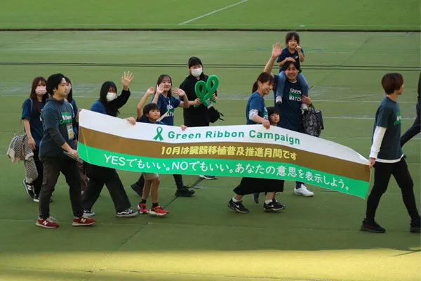 ハーフタイムには学生がグリーンリボンキャンペーンの横断幕を持ってフィールドを歩き、1万人以上集まった試合会場で臓器提供啓発活動をアピール。学生にとって社会貢献の意義を勉強する貴重な場となりました。