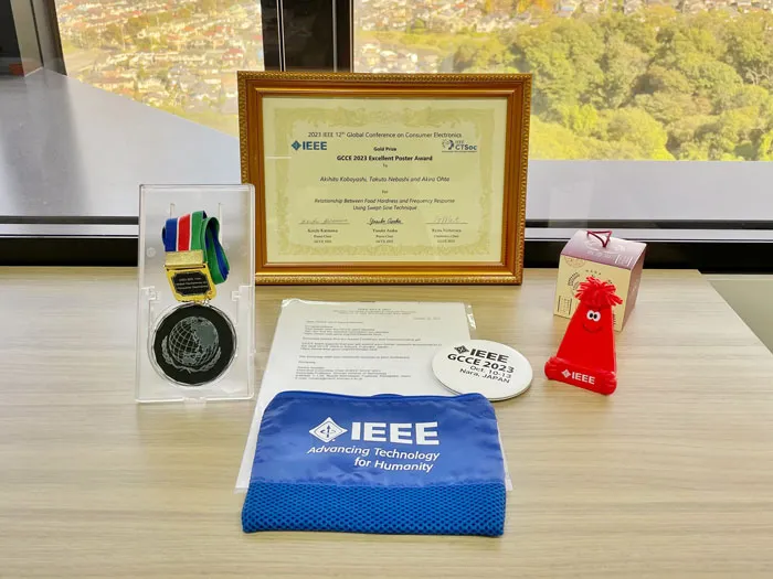 2023年10月、奈良県にて開催された国際会議「2023 IEEE 12th Global Conference on Consumer Electronics (GCCE 2023)」 にて、AIシステム科学生と教員による共同研究”Relationship Between Food Hardness and Frequency Response Using Swept-Sine Technique”(音を用いて食品の硬さを評価する研究)が、「GCCE2023」における最優秀賞の一つ「IEEE GCCE 2023 Excellent Poster Awards Gold Prize」を受賞しました。