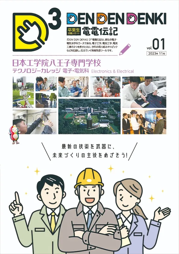 日本工学院八王子専門学校 電子・電気科では、卒業生の方々にご協力いただき、学科の取り組みやトピックなどを記録し、伝えていく情報発信ツール「DEN DEN DENKI D³ 電電伝記」を発刊いたしました。