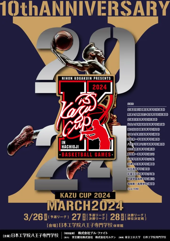 日本工学院八王子専門学校(東京都八王子市)では、ウインターカップを制した福岡第一をはじめ、全国の高校バスケットボールの強豪16チームが集まり、国内トップレベルの熱戦を繰り広げる『KAZU CUP 2024』を3月26日(火)~28日(木)の日程で八王子キャンパスにて実施します。今回は10回目の節目にあたり、これまでに今や日本を代表する選手である八村塁、渡邊雄太、河村勇輝、富永啓生らがこの大会で熱い戦いをしてきました。今回も熱戦が繰り広げられることは間違いありません。