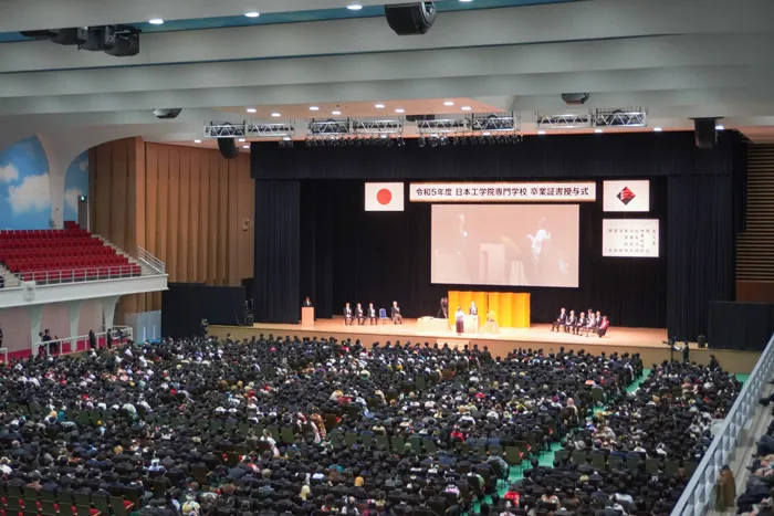 日本工学院八王子専門学校では3月14日に体育館アリーナにて、日本工学院専門学校では3月15日に片柳アリーナにて、それぞれ卒業証書授与式が盛大に執り行われました。