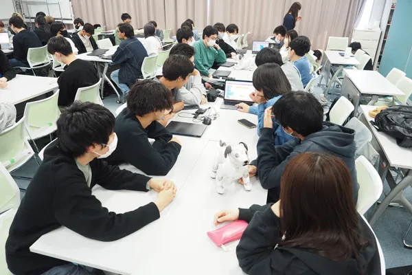 講義は開発元の「SONY」がどんな企業であるかという紹介から始まり、「aibo」の歴史や開発に対する思い入れ、こだわりとともに、「aibo」に詰まった技術や機能などをご説明いただいた後に、実際に「aibo」にプログラミングを行うワークショップを実施。「aibo」には、プログラミングの知識が無くても扱える「aiboビジュアルプログラミング」というツールが備えられており、プログラムの初心者でも簡単に「aibo」を思い通りに動かすことができます。学生たちもまだ入学したばかりの1年生でしたが、ビジュアルプログラミングを活用して「aibo」にさまざまな動きをプログラムし、そのかわいい動きに夢中になっていました。