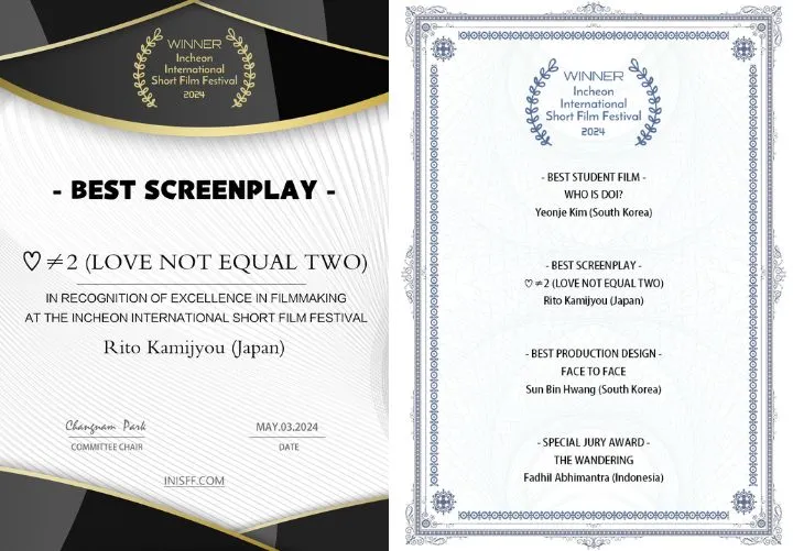 今年3月に卒業した学生の制作による卒業制作ドラマ「♡≠2(Love not equal Two)」が韓国のINCHEON INTERNATIONAL SHORT FILM FESTIVALにてBEST SCREENPLAYを受賞しました。