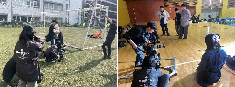 事務局より提供いただいた過去大会の映像に加え、日本工学院と教育連携協定を締結している大森学園高等学校に協力いただき撮影を行いました。大森学園高等学校では、先生方や生徒さんの協力のもと、各部活動の練習風景や部室の様子を3日間にわたり撮影。そのほか、冒頭の弓道のシーンでは、選手を学校内のスタジオにお呼びして撮影しています。