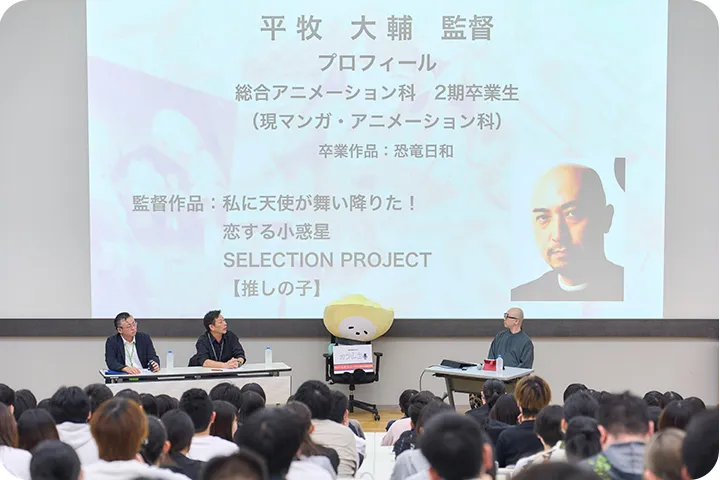 2024年10月18日(金)、日本工学院専門学校(蒲田校)で、日本工学院マンガ・アニメーション科卒業生でアニメ監督の平牧大輔氏による特別公開講座が、『ココでしか聞けない話/オフレコ』第6回講座として行われました(オンラインで日本工学院八王子専門学校にも同時配信)。マンガ・アニメーション科の教員が進行役となり、学生時代の経験や代表作『【推しの子】』の制作などについて話していただきました。